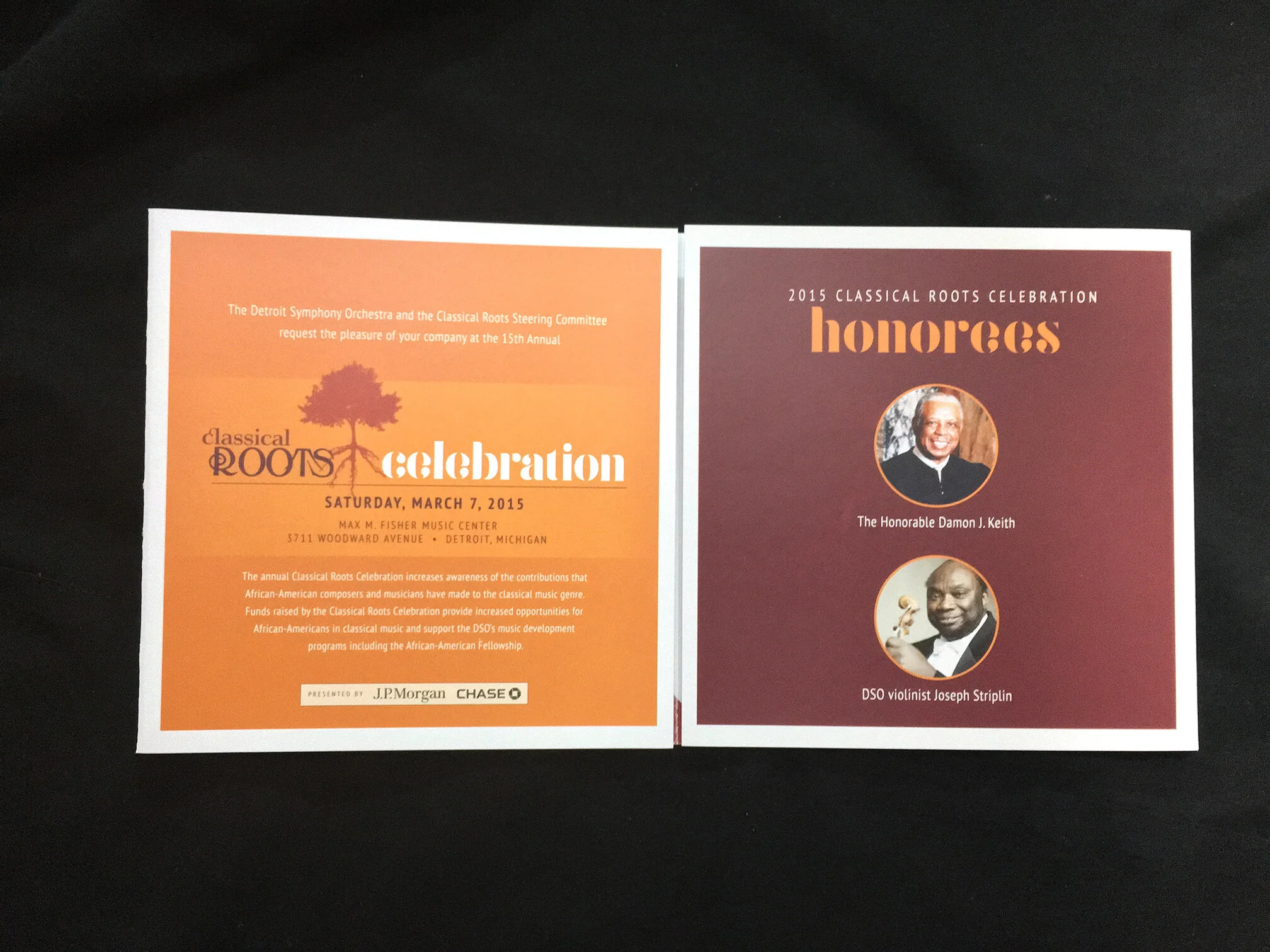Since 1978, the Detroit Symphony Orchestra’s Classical Roots concerts have increased the awareness of the significant contributions that African-American composers and musicians have made to classical music. The CLASSICAL ROOTS CELEBRATION, held in conjunction with the concerts since 2001, raises funds to provide increased opportunities for African-Americans in classical music through DSO programs like the African-American Orchestra Fellowship and African-American Composer Residency. After rebranding the event in 2013, New Wine has driven the annual visual strategy and design for gala content from formal invitations and marketing initiatives to program books and display signage.
